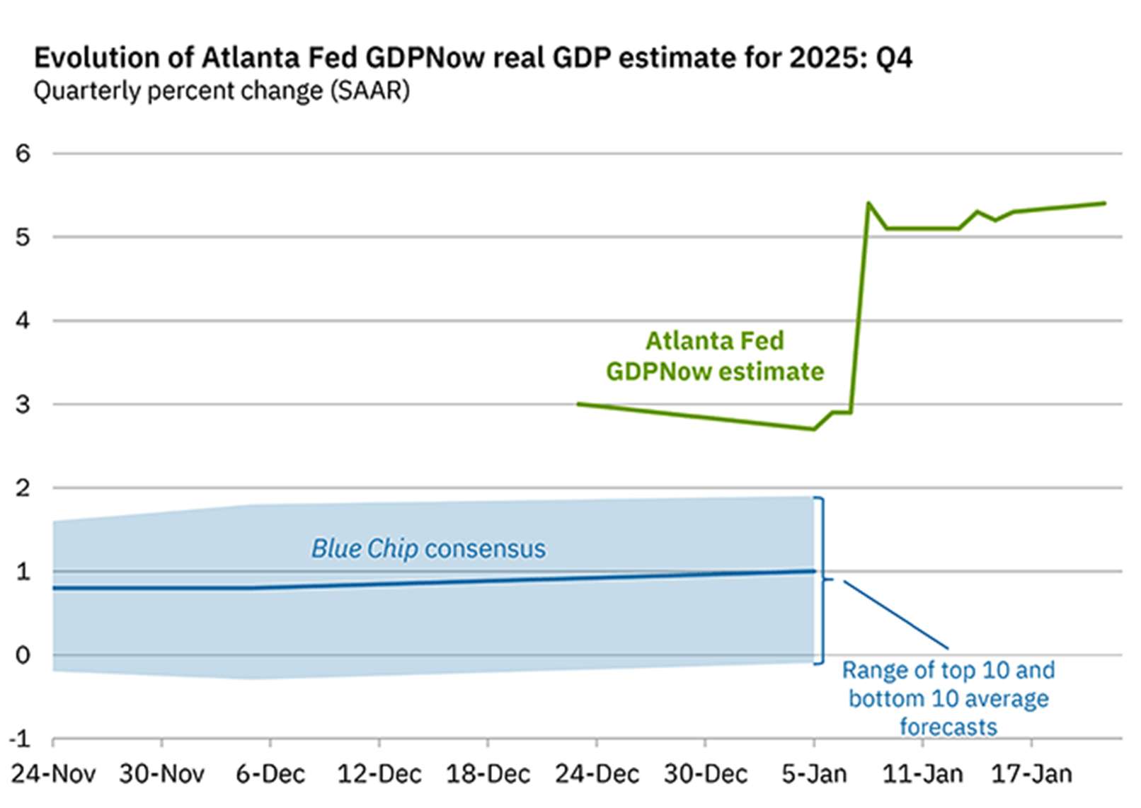 The U.S. economy continues to be robust and is growing above trend, powered by expansive fiscal policy, dovish monetary policy, a productivity boom and the surge in artificial-intelligence investment. In the third quarter, U.S. GDP grew 4.3% (not released until January due to the gov shutdown), driven by personal consumption and domestic investment growth. ISM and S&P Global’s Manufacturing and Services PMI and Retail Sales continue to be supportive. NFIB Small Business Optimism Index is persistently optimistic. The Atlanta Fed’s GDPNow model is now estimating real GDP of +5.4% for Q4 (Chart 1).