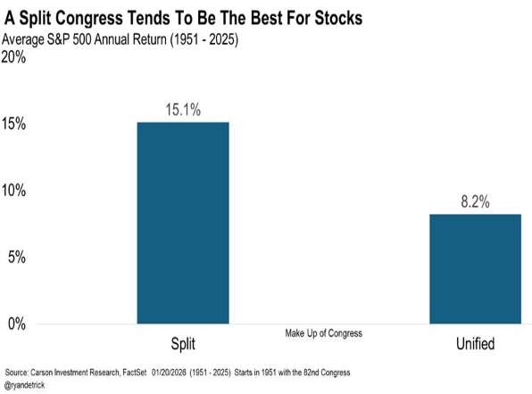 Mid-Term election years tend to be periods of consolidation. Policies enacted in the first year of the Presidential term are digested, and uncertainty rises with potential shifts in congress. Seats are typically lost by the Presidential party, and with the current tight majority it is likely we will move to a split House and Senate. But not to worry, subsequent years are empirically strong and a split congresses fares best for equity returns (Chart 7, 8). A pause should be welcomed to keep exuberance in check and allow valuations to moderate.